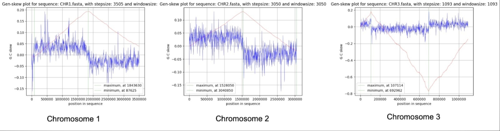 При расчете GC-skew на определенном участке интересующей нас последовательности получаются значения, которые затем взятием интеграла функции GC-skew образуют линию графика, минимум и максимум которого соответствуют расположению oriC и ter. Burkholderia seminalis имеет три хромосомы, поэтому поиск oriC и ter осуществлялся для каждой из них. Для расчёта GC-skew использовался сервис webskew (5).