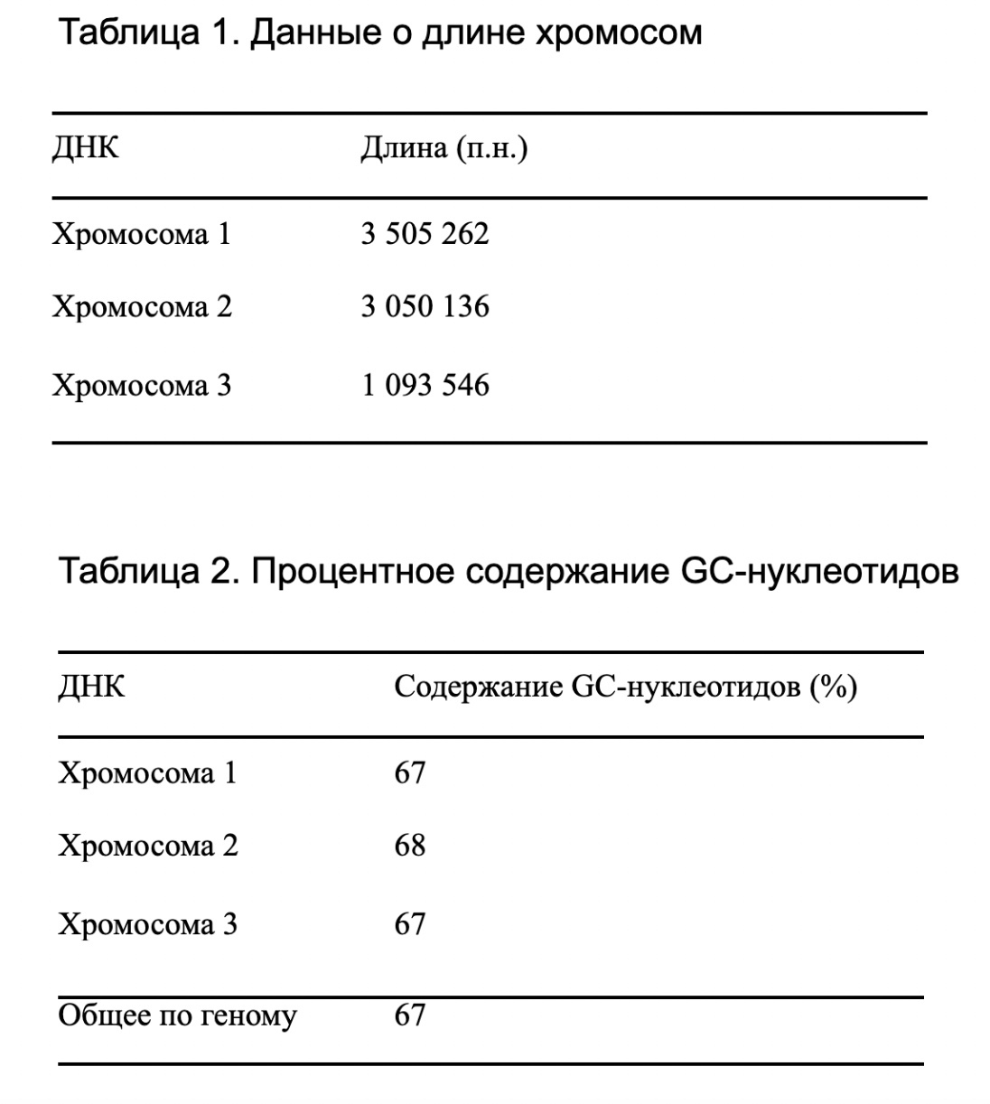 Геном Burkholderia seminalis представлен тремя хромосомами. Информация о длине хромосом в п.н. бралась из assembly stats Burkholderia seminalis из базы данных NCBI (1). Как видно из данных, наименьшую длину имеет третья хромосома (1 093 546 п.н.). Общая длина генома бактерии составляет 7 648 944 п.н. Всего в геноме 6969 генов (включая белок-некодирующие последовательности). Для каждой из хромосом определен процентное содержание GC нуклеотидов (gc-perc), который рассчитывается по формуле (количество-GC-нуклеотидов) / (количество-ATCG-нуклеотидов) представленное в процентах. Расчет производился при помощи кода, написанного на Python (2). Как видно по таблице, отличие в процентом содержании GC-нуклеотидов у второй хромосомы незначительно, и в среднем по всему геному gc-perc равен 67%. Высокое содержание GC-пар обеспечивает поддержание стабильности структуры ДНК при высоких температурах или других экстремальных для клетки условиях.