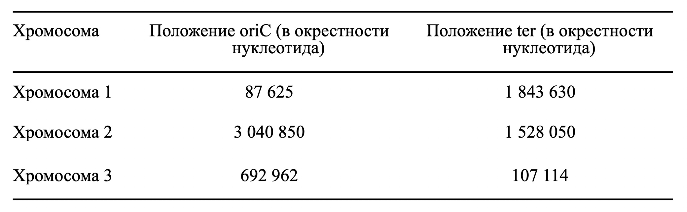 Был показан факт того, что с помощью вычисления соотношения между нуклеотидами G и C (так называемый GC-skew), можно определить место начала репликации (origin, далее - oriC) и ее конца (terminator, далее - ter). Место минимального значения GC-skew соответствует oriC, а максимального - ter. Действительно, ведь малая доля GC-пар в месте начала репликации значительно упрощает расплетение цепочки ДНК, что обеспечивает успешное формирование репликационных вилок. Высокий GC-состав в свою очередь будет способствовать терминации.