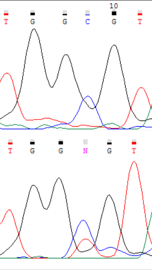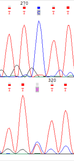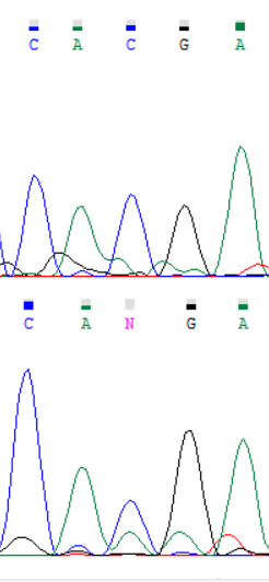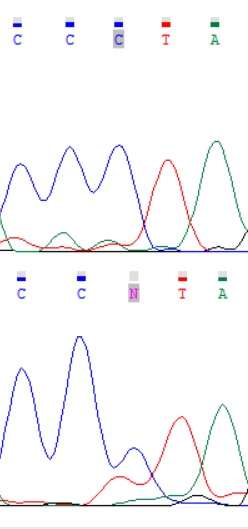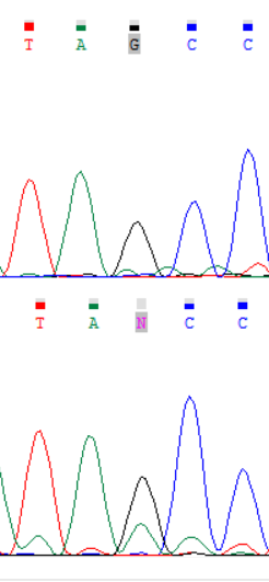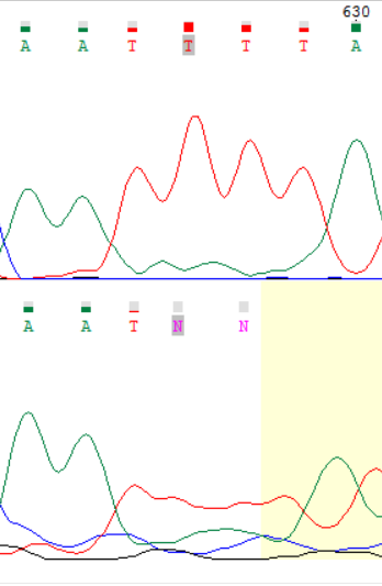 Затем мы устраняли неточности в прочтении, основываясь на данных хроматограммы и последовательности комплементарной цепи. Все исправления были сделаны строчными буквами. В большинстве случаев в хроматограмме просто произошло затекание соседних продуктов. N в таком случае можно легко восстановить с помощью выравнивания