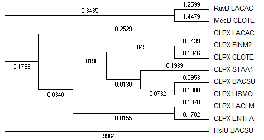 Я воспользовалась программой BLAST на сайте NCBI. Чтобы найти ортологи CLPX_BACSU я искала по белкам других бактерий и выбирала белки с мнемоникой CLPX. Чтобы найти паралоги, я искала похожие последовательности в одном организме, используя в качестве запроса последовательность CLPX соответствующего организма. И построила дерево, используя fneighbor.