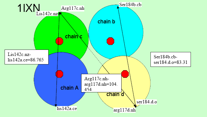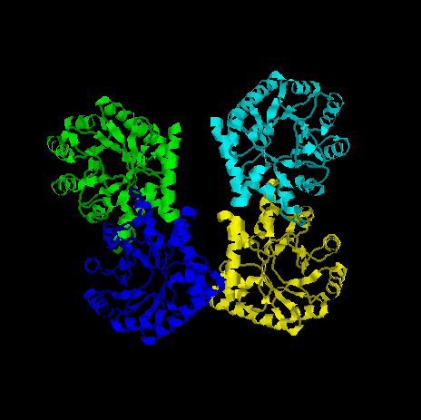 Согласно цветовому разделению в программе RasMol, в структуре малекулы белка pdxj содержится 4 полипептидные цепи, а также, 4 лиганда.( 2хDXP 1-DEOXY-D-XYLULOSE-5-PHOSPHATE и 2хG3P 3-PHOSPHOGLYCEROL ).В пространстве молекула представляет собой четвертичную структуру белка, состоящую из 4 глобул, расположенных по двум скрещивающимся прямым. |