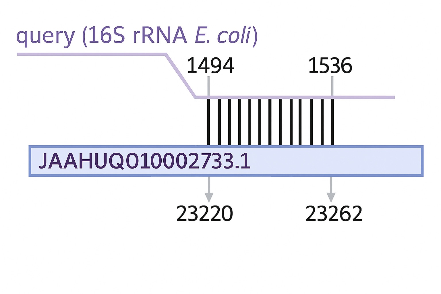 BLAST нашёл 15 хитов, все выравнивания имеют: 1) длина выравнивания всего 43 нт 2) идентичность ≈ 88% 3) все хиты соответствуют одному и тому же участку бактериальной 16S: 1494–1536 4) E-value ≈ 8e-05