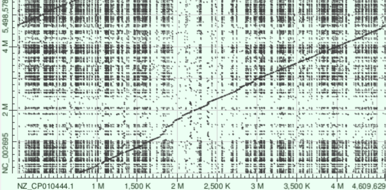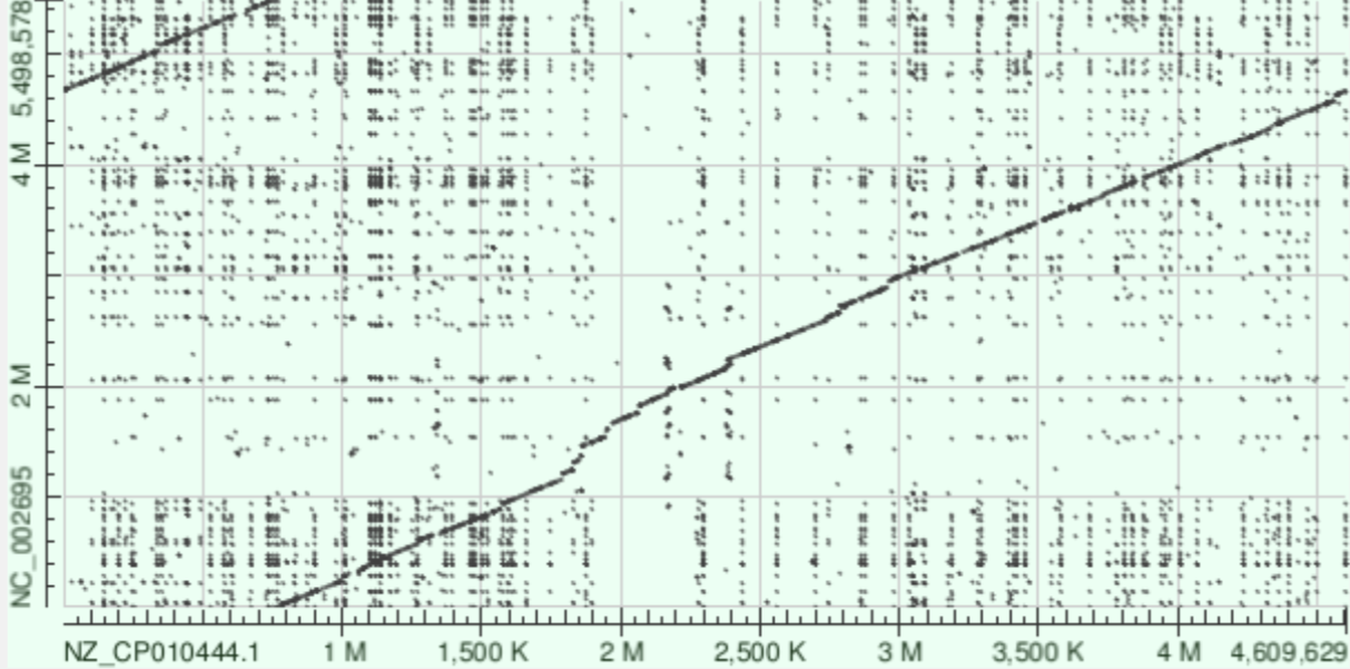 Видна одна чёткая главная диагональ — это большие консервативные блоки, сохранившиеся между штаммами. В верхней части карты заметен небольшой параллельный участок диагонали. Скорее всего его нахождение связано с тем, что оба генома кольцевые, но записаны с разными точками начала.