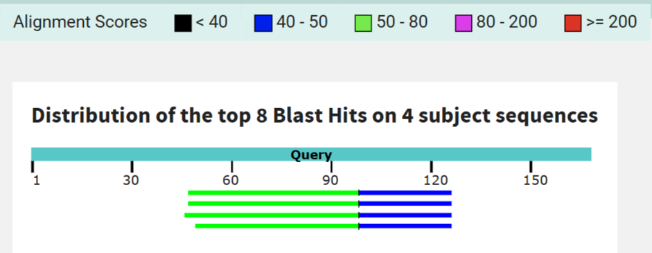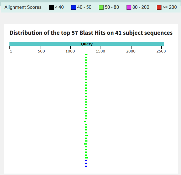 График распределения лучших попаданий tblastn показывает, что все найденные последовательности выравниваются с нашим белком примерно на половину его длины (около 46–48%). Окраска сегментов соответствует высоким alignment score, характерным для дальних, но реальных гомологий.