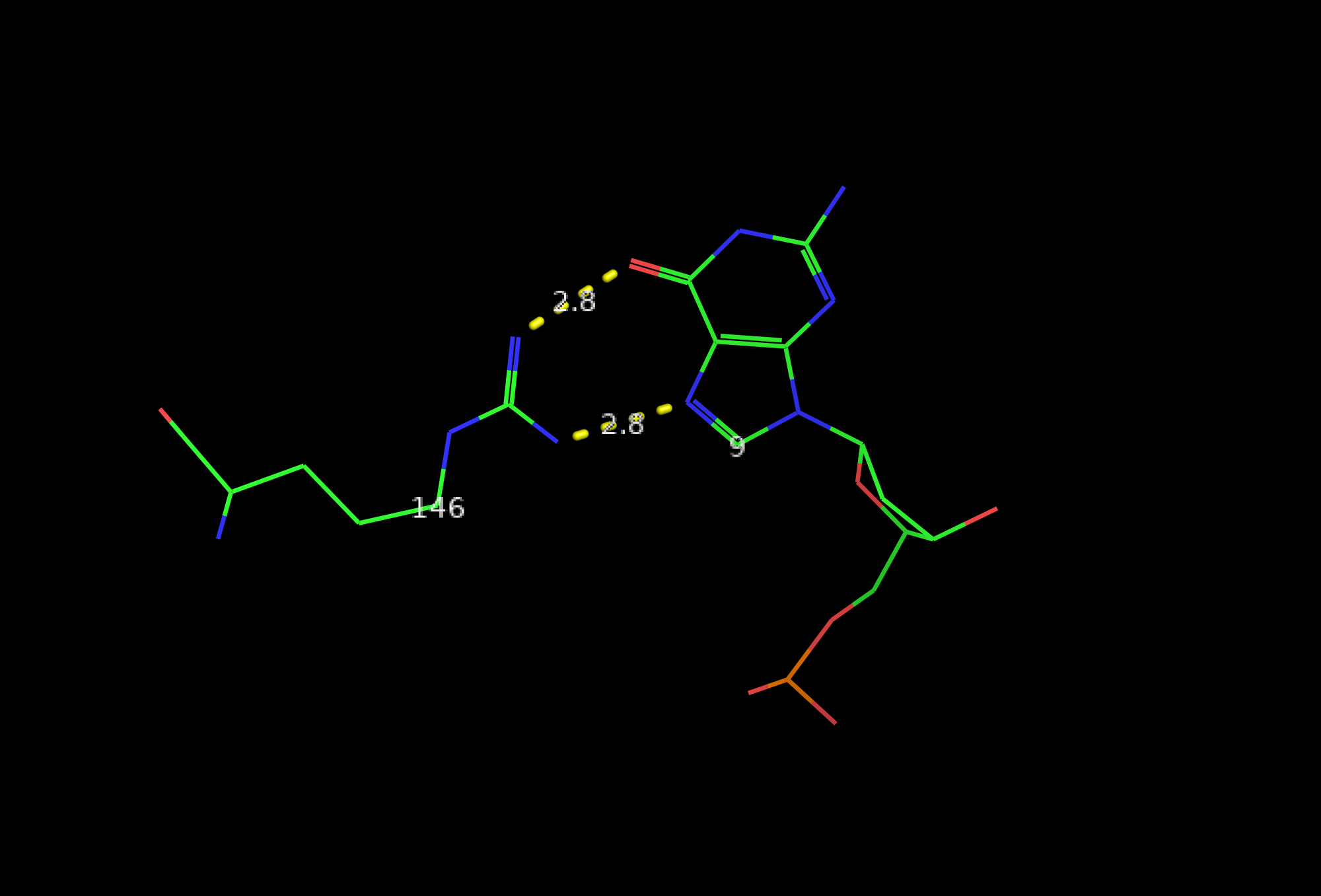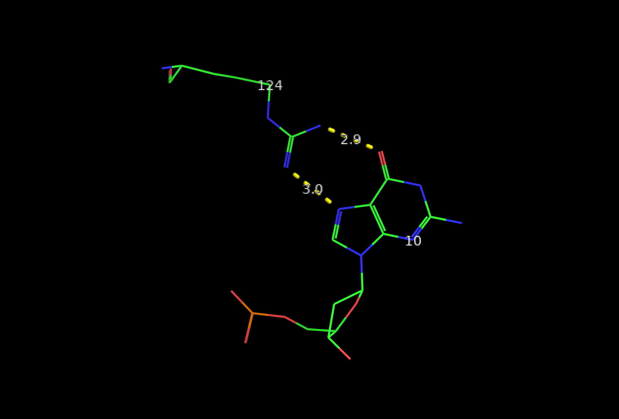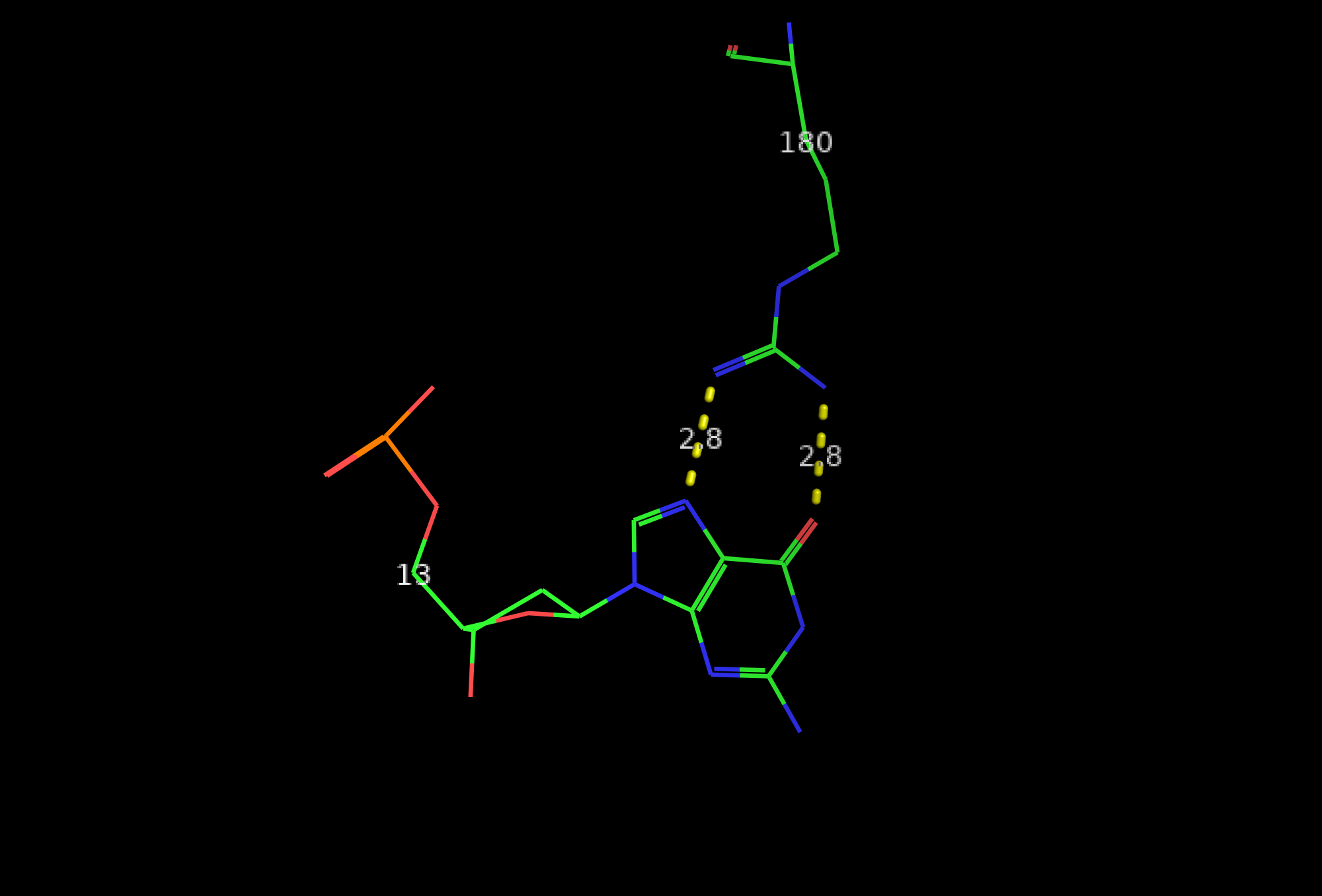Для выполнения следующего упражнения использовался пользовательский скрипт PyMol. Данная мне структура представляла собой двухцепочечную ДНК, связанную с белком. В качестве ДНК связывающего мотива у белка присутствуют цинковые пальцы. Примечательно, что почти все взаимодействия по азотистым основаниям проходят по большой бороздке.