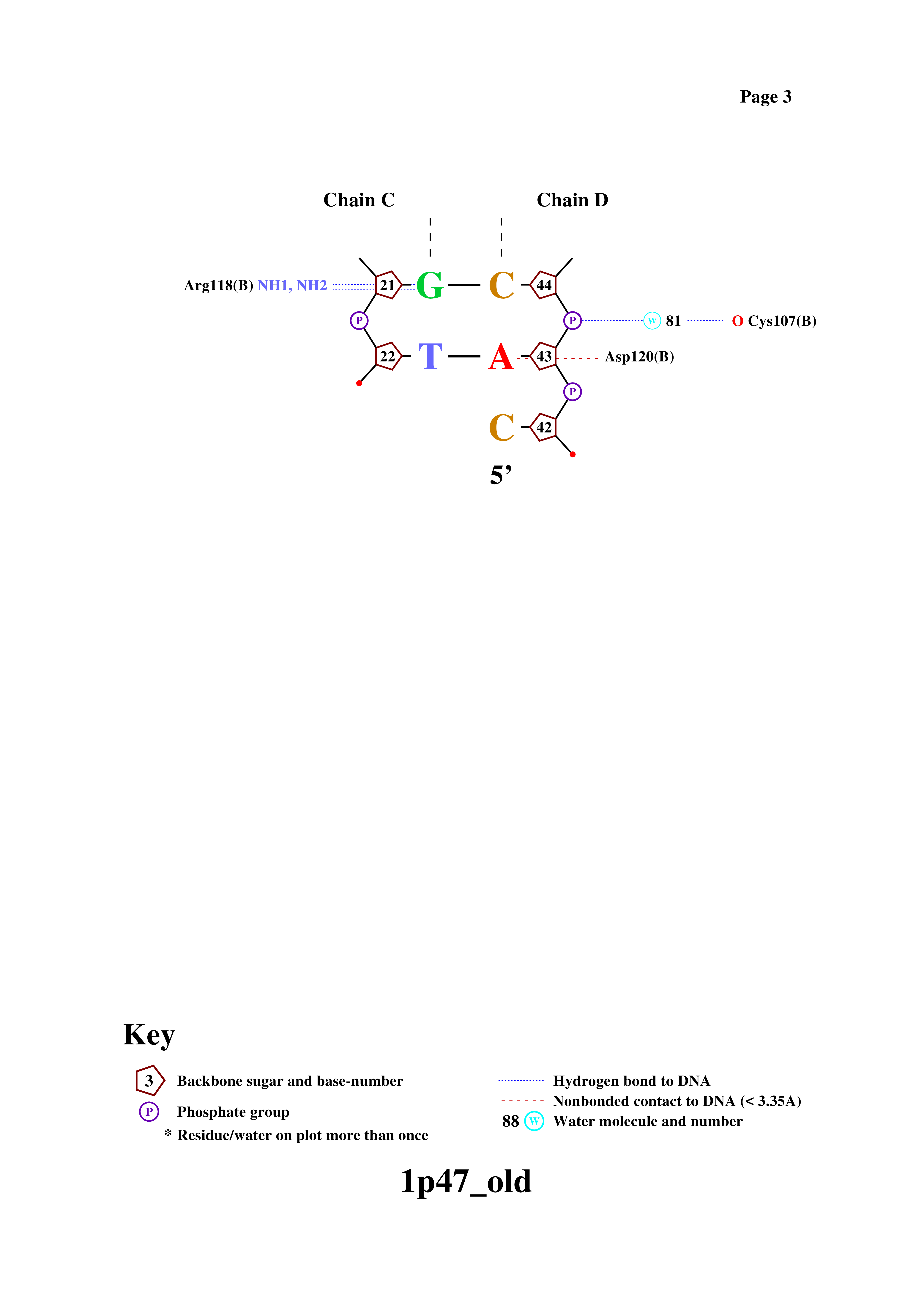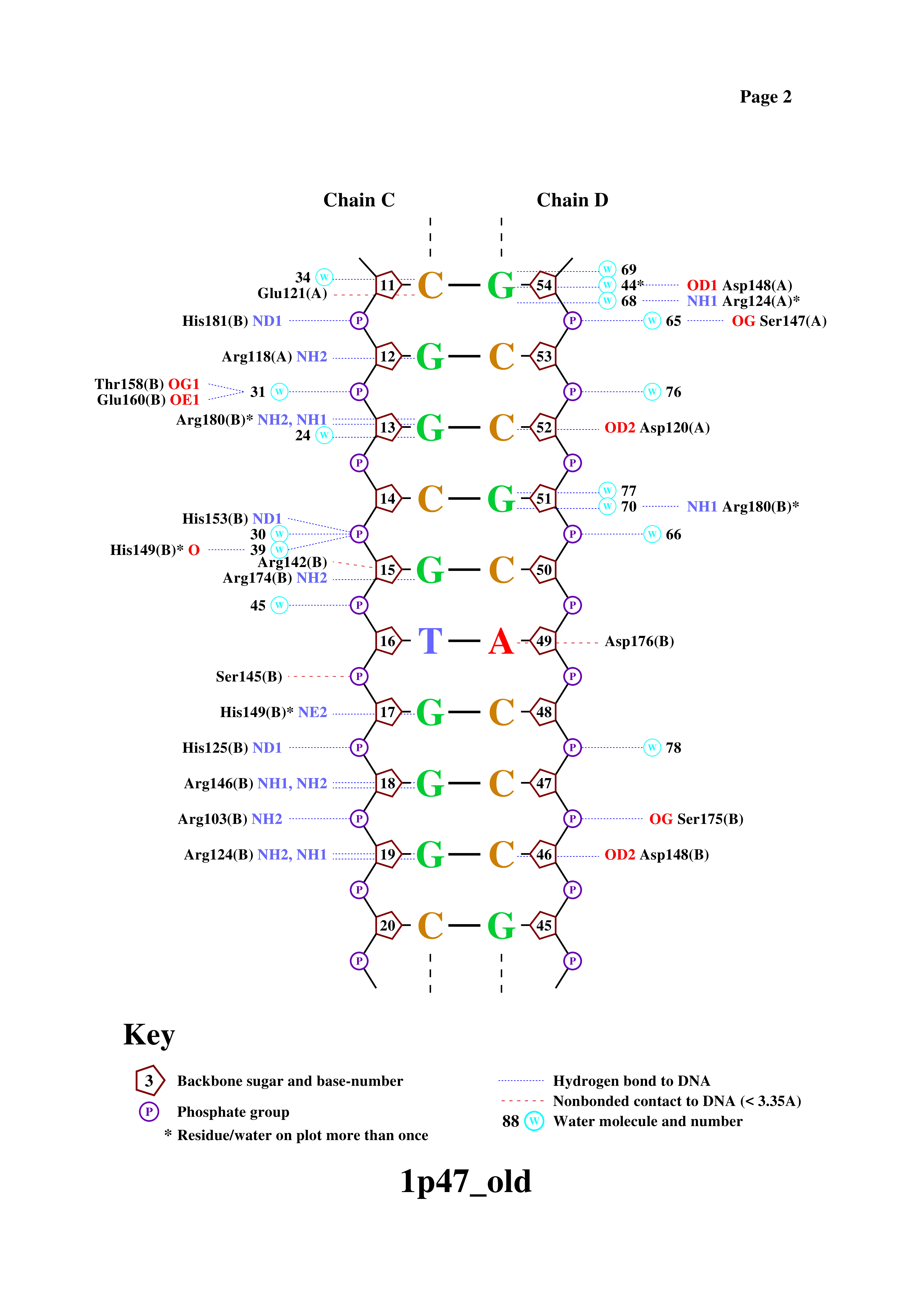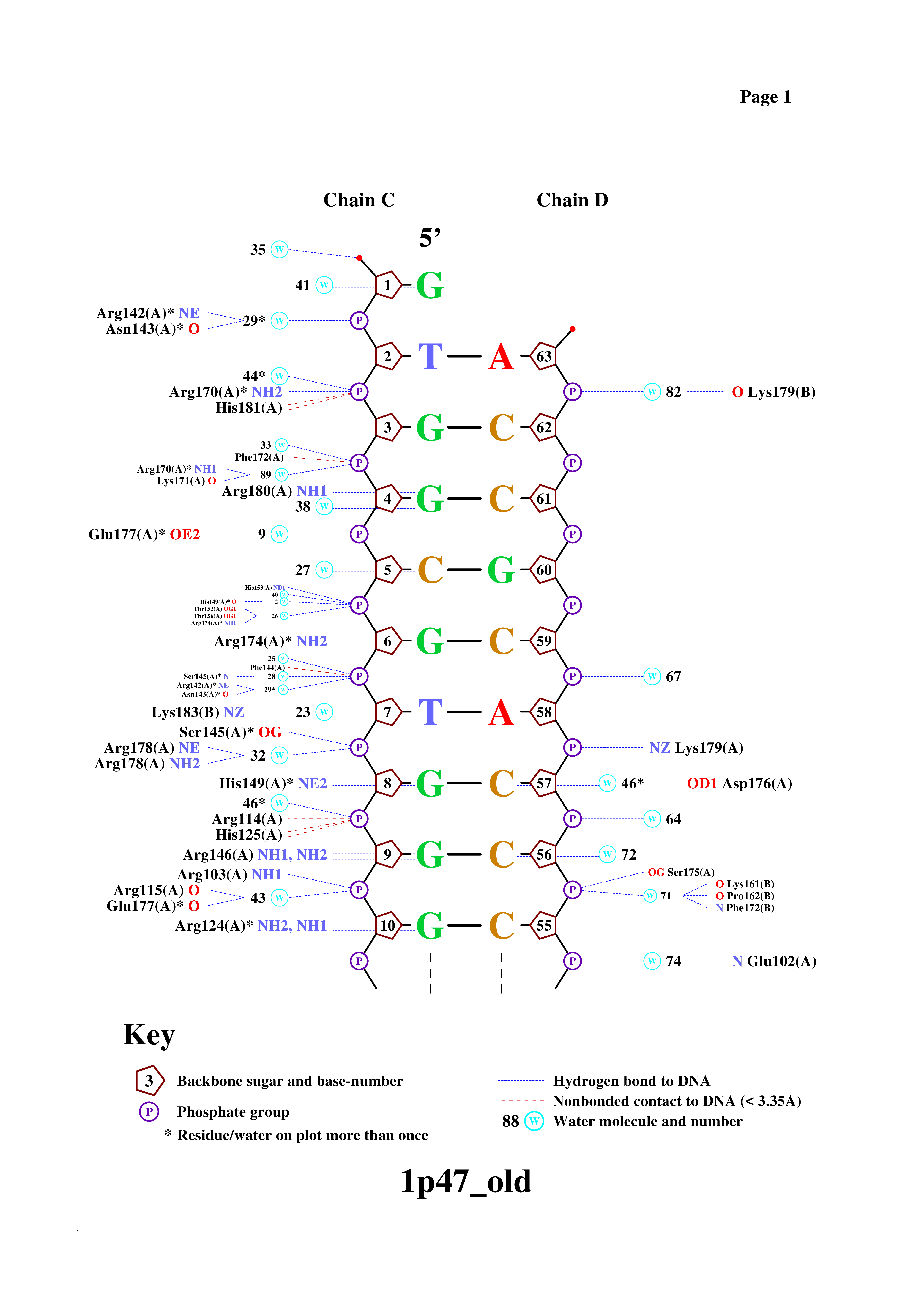 Пользуясь программой nucplot на сервере кодомо была получена визуализация контактов ДНК с остатками аминокислот белка на трёх страницах, представленых ниже.