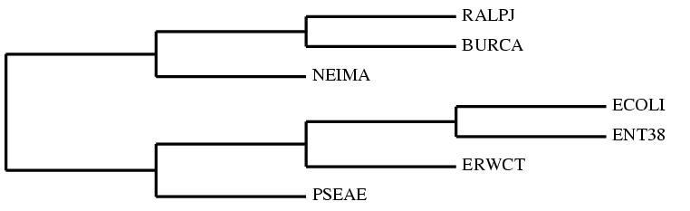 ((PSEAE, (ERWCT, (ENT38, ECOLI))), (NEIMA, (BURCA, RALPJ)));