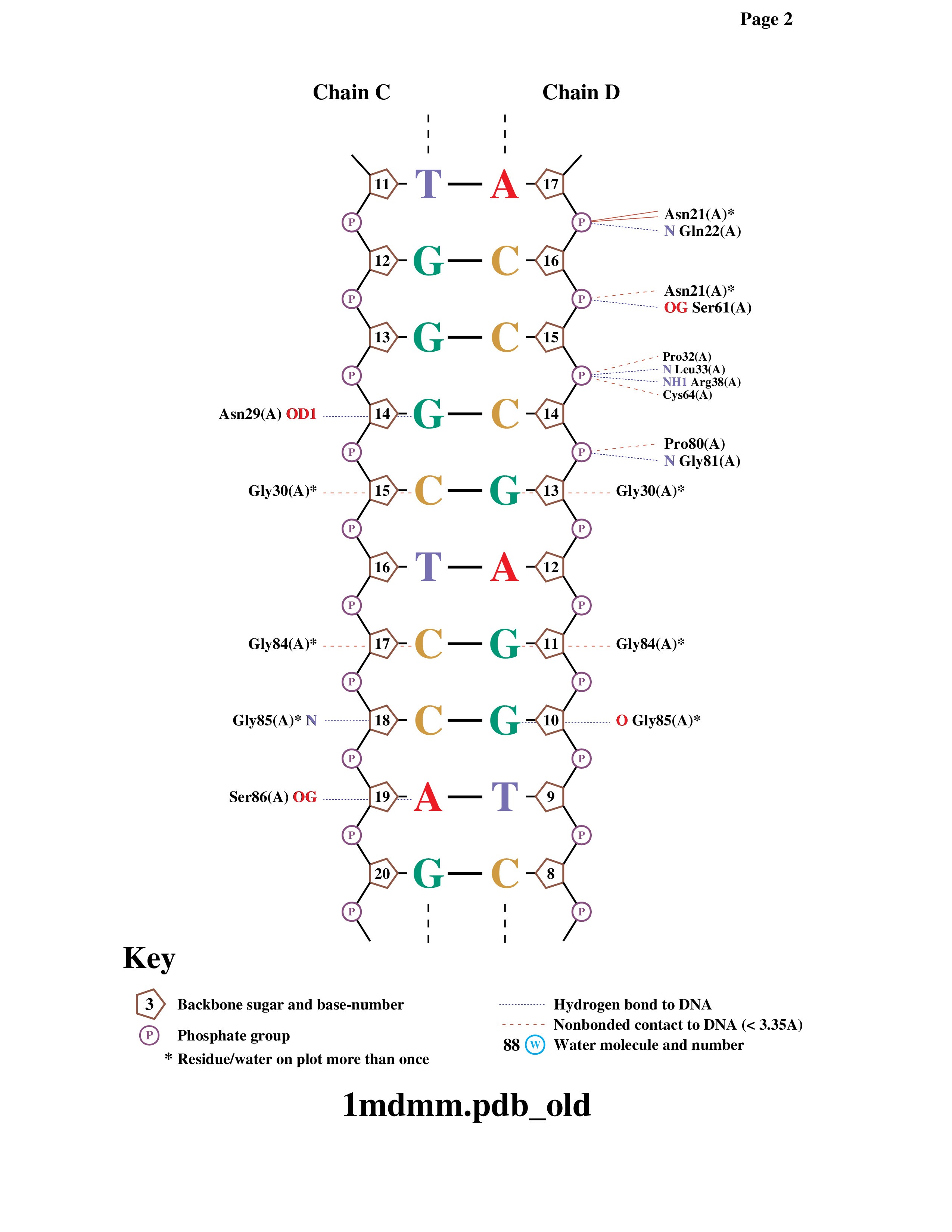 Таблица 2. ДНК-белковые контакты в структуре 1mdm.