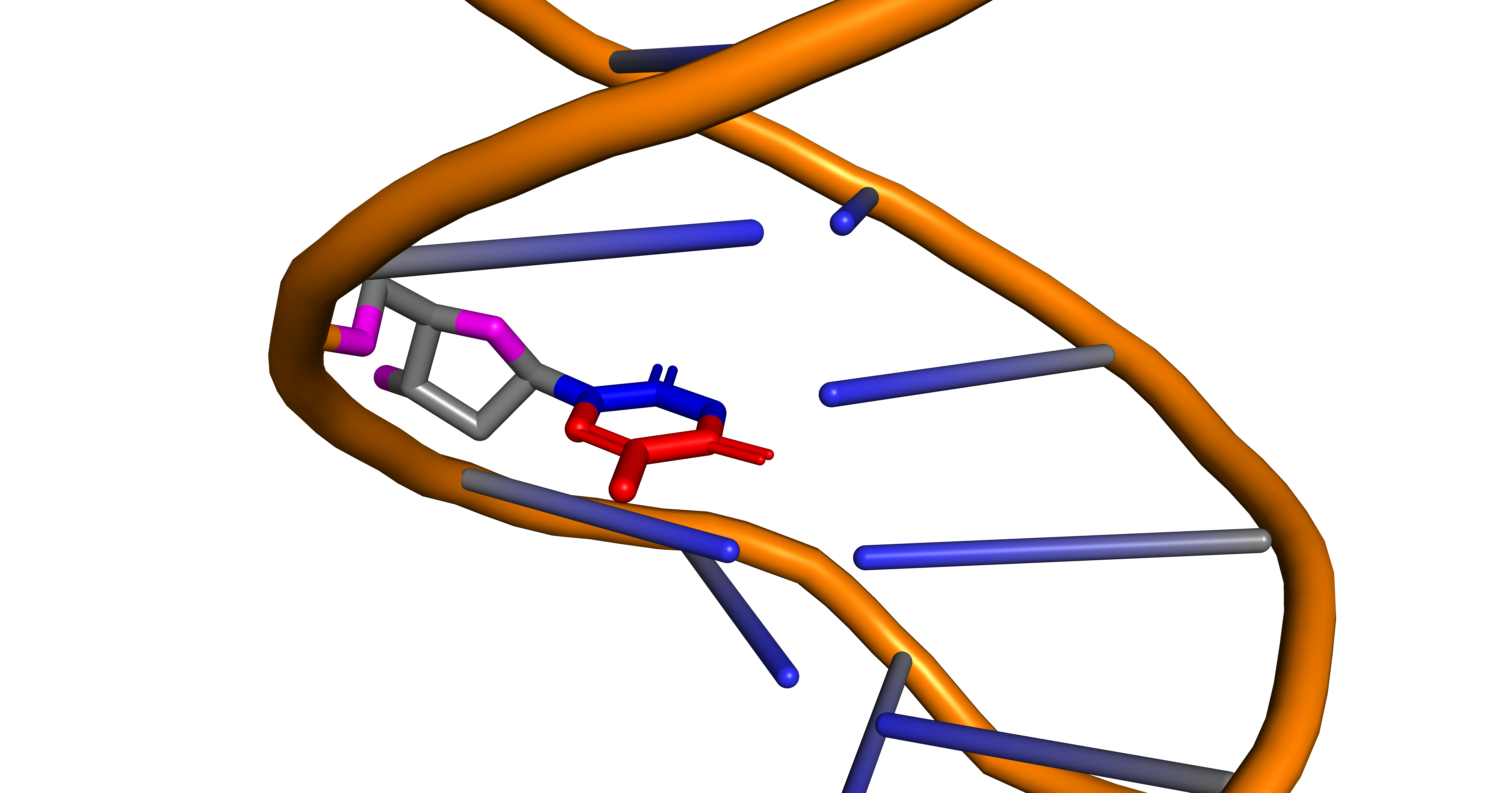 Для одного из тиминов эксперементальной структуры днк 1bna (в B-форме) из базы данных PDB изображено какие атомы азотистого основания обращены в сторону малой бороздки, а какие в сторону большой.