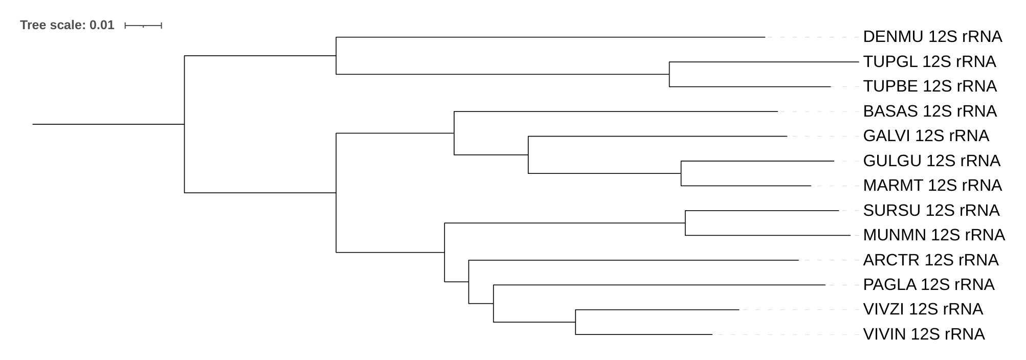Дерево 12S рРНК по топологии идентично дереву видов (за отсутсвием названного уже вида Cynocephalus volans), за исключением того, что Arctogalidia trivirgata (ARCTR) является сестринским ко всем остальным рассматриваемым Виверровым (Viverricula indica (VIVIN), Viverra zibetha (VIVZI), Paguma larvata (PAGLA)), а не сестринской ветвью к Paguma larvata (PAGLA), также как и в случае с цитохромами.