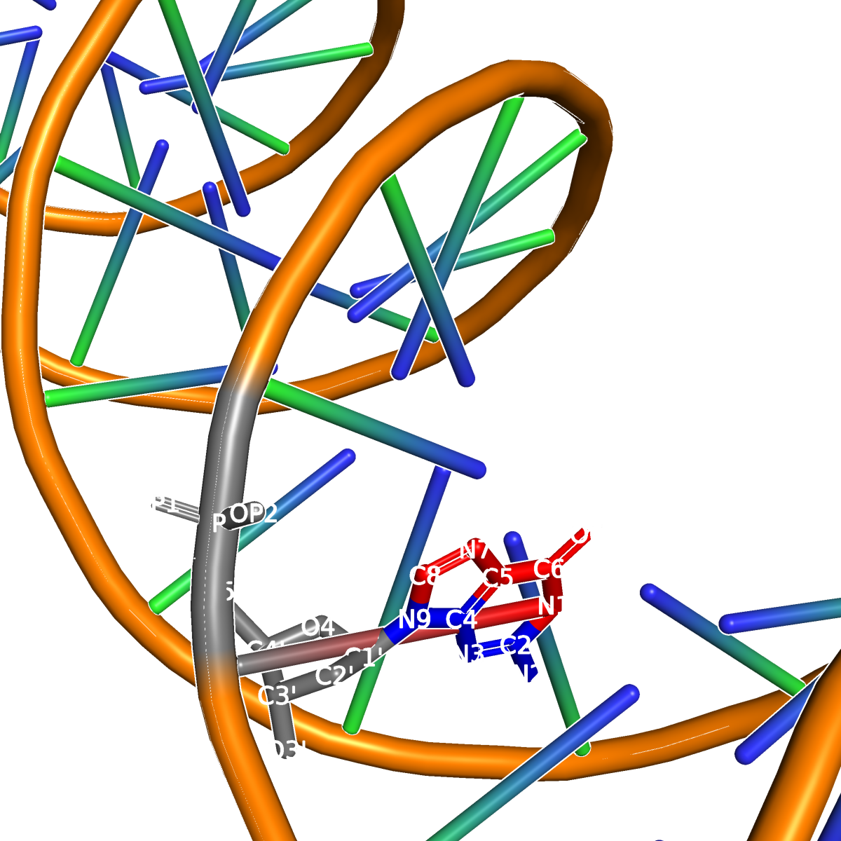 В сторону большой бороздки обращены атомы: С8, N7, C5, C6, N1, O6