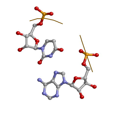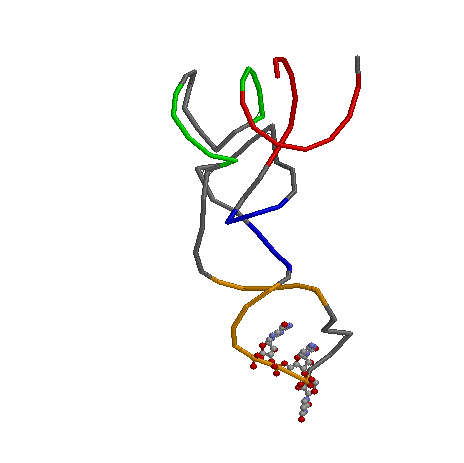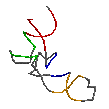 Акцепторный стебель : 901-907, 966-972. D-стебель : 910-912, 923-925. Антикодоновый стебель: 927-931, 939-943. Т-стебель: 949-953, 961-965. В структуре есть и вариабельная петля. Это 44-48. Создаём скрипт для получения в RasMol изображения остова исследуемой тРНК, где акцепторный стебель выделен красным, Т-стебель - зеленым, D-стебель - синим, антикодоновый - оранжевым.