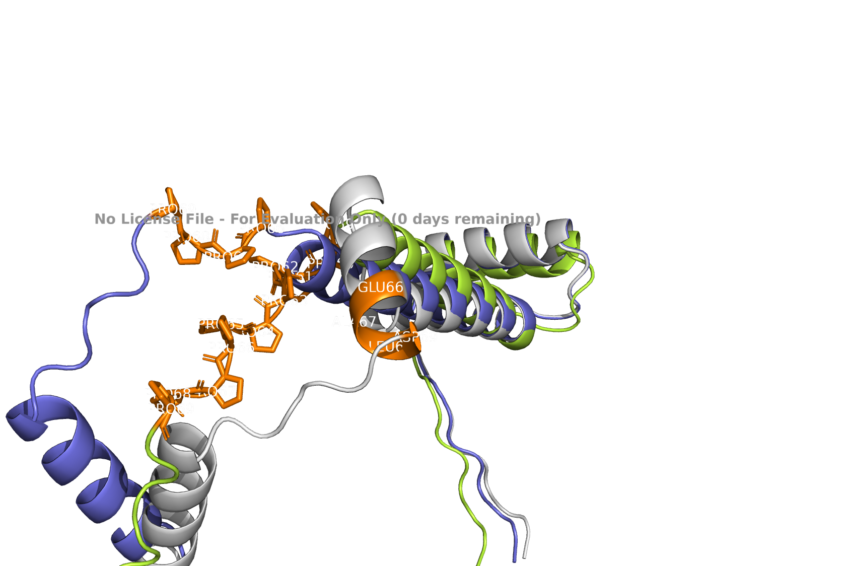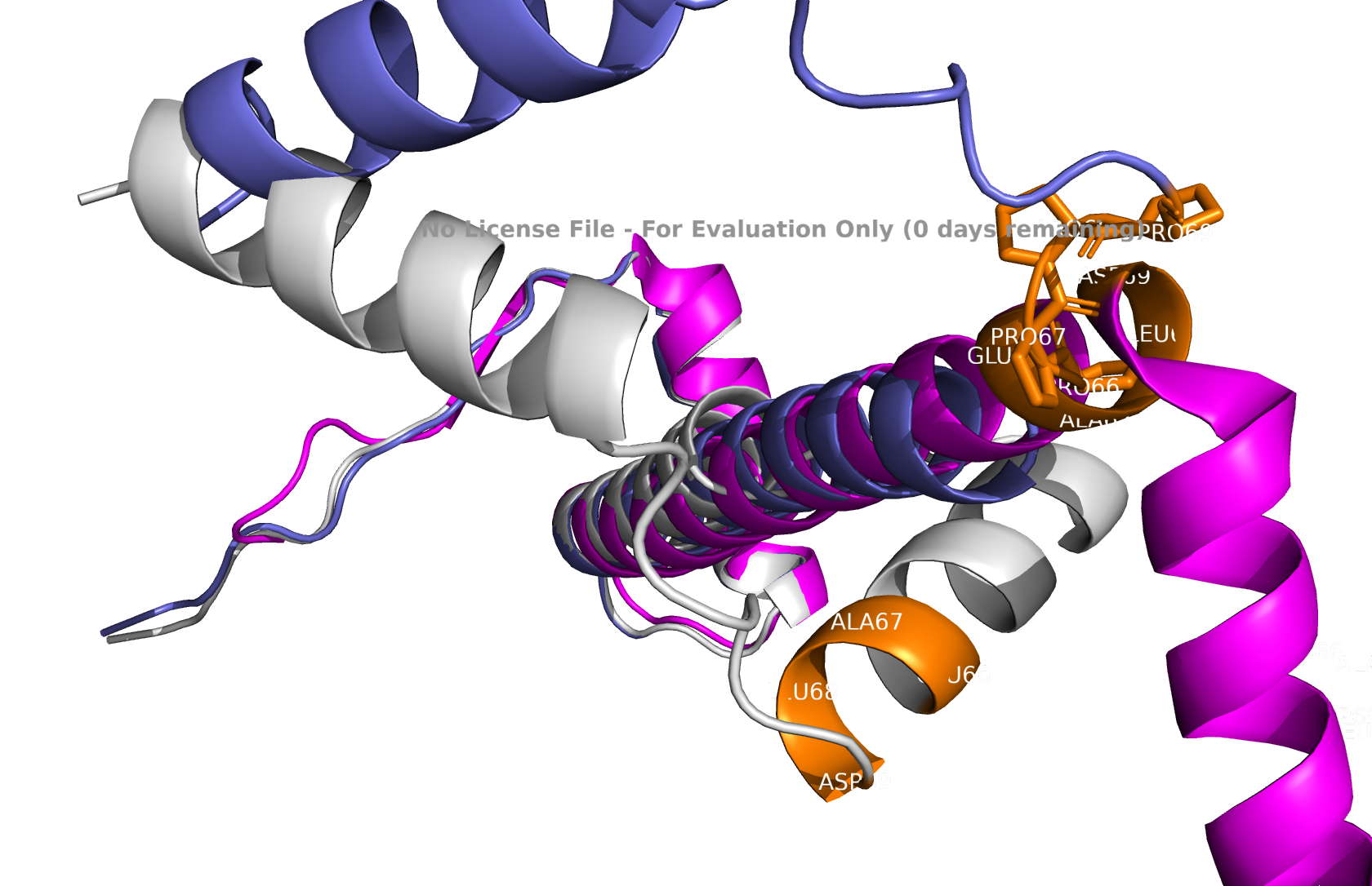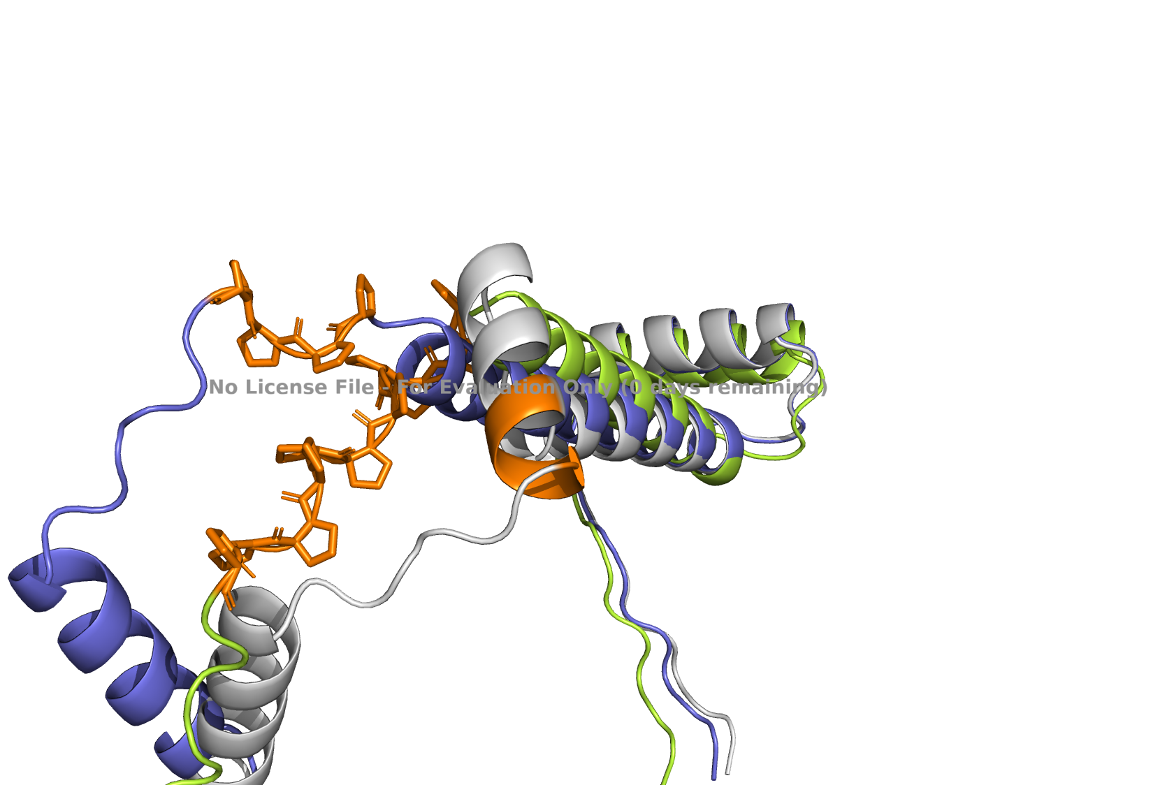Видно общий каркас– альфа-спираль по центру. На концах предсказанная структура отклоняется от pdb, что может говорить о наличии линкера.