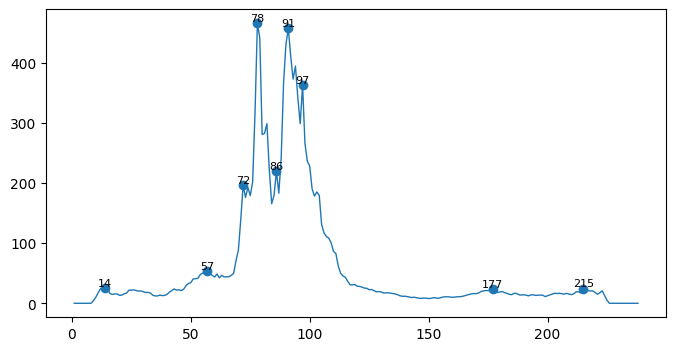 Рис 11. График зависимости split_value от номера остатка (номера остатков на пиках отмечены).