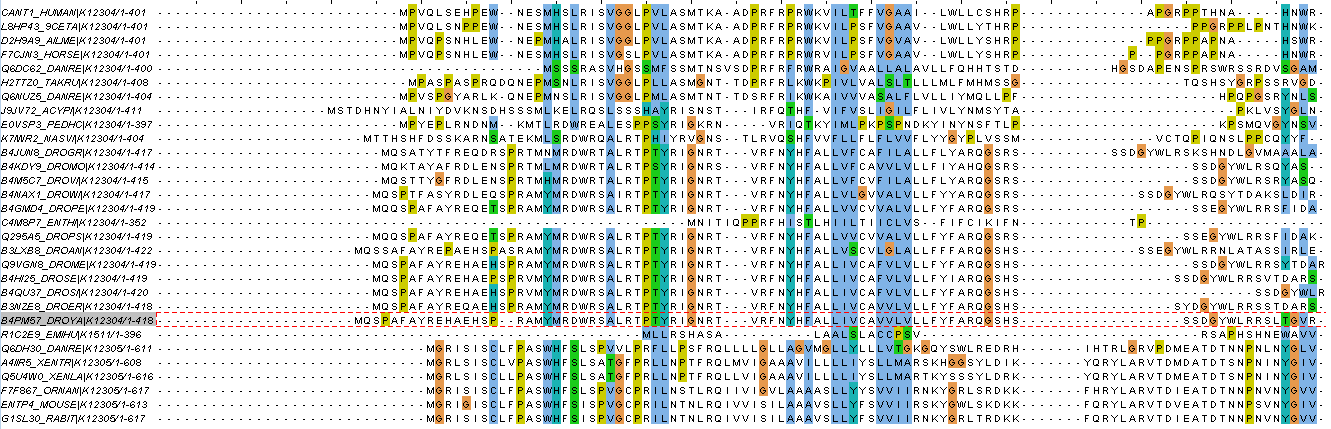Однако хочу заметить, что белки кластера K12304 плохо выравниваются с остальными белками (хотя общие выровненные блоки все же имеются, основанные в основном на функциональном сходстве аминокислот, а не на идентичности), поэтому этот ряд белков и выделился в отдельную кладу.