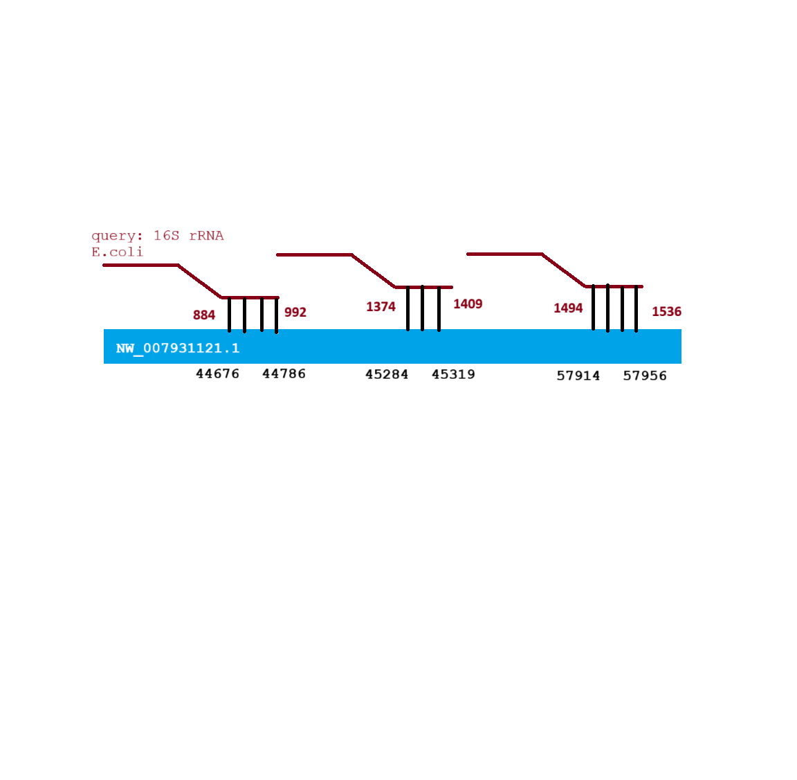 Затем скачал файл с двумя рРНК E.coli и поместил записи в rRNA_ecoli1.fasta и rRNA_ecoli2.fasta. Затем я сначала провел поиск с помощью blastn, который не дал никаких находок: