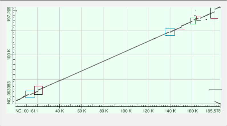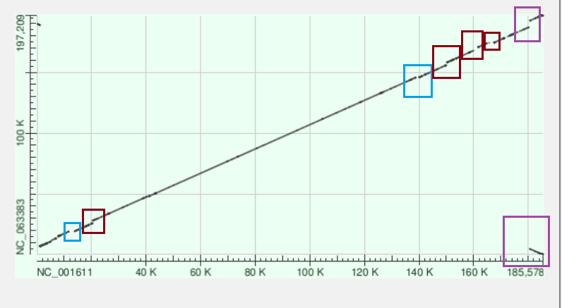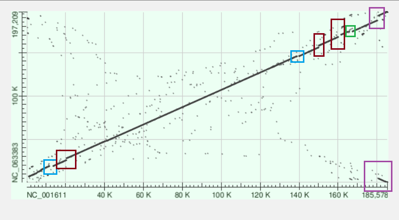 Синим я пометил вставки, красным - делеции, фиолетовым - инверсии, также на картах есть различные транслокации и дупликации очень маленьких участков (особенно на карте для tblastx).
