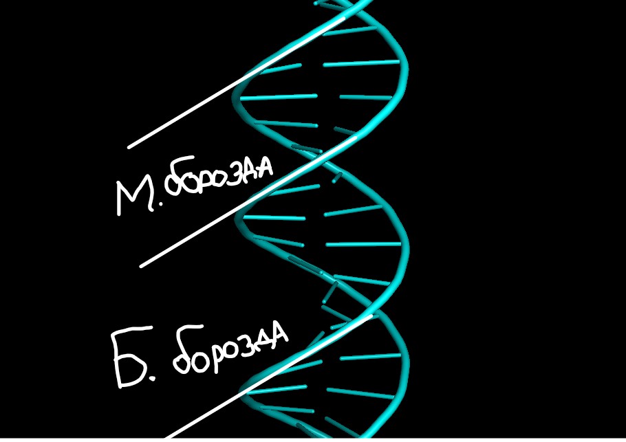 | Ширина большой бороздки (Å) | 17.0 (цепь А: A14 - цепь B: A30) | 17.3 (цепь А: C3 - цепь B: T17) | 18.3 (цепь А: G9 - цепь B: C36) |