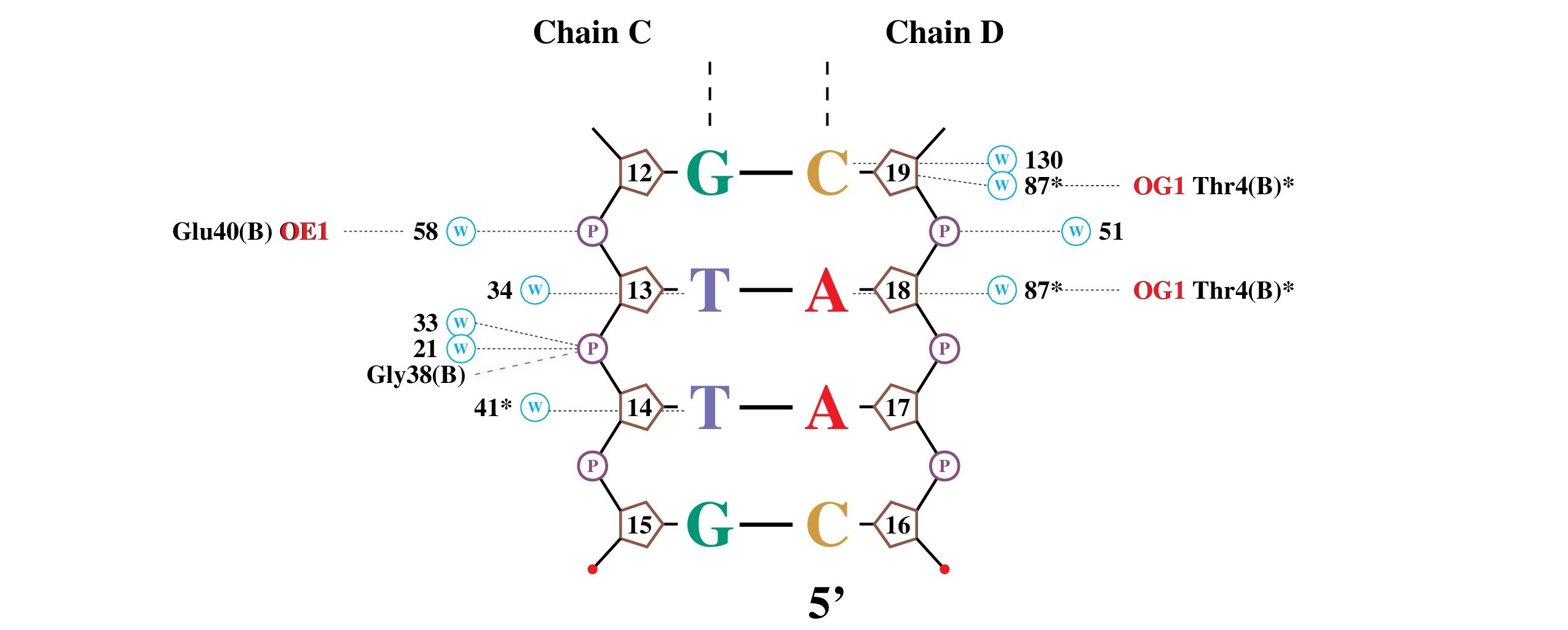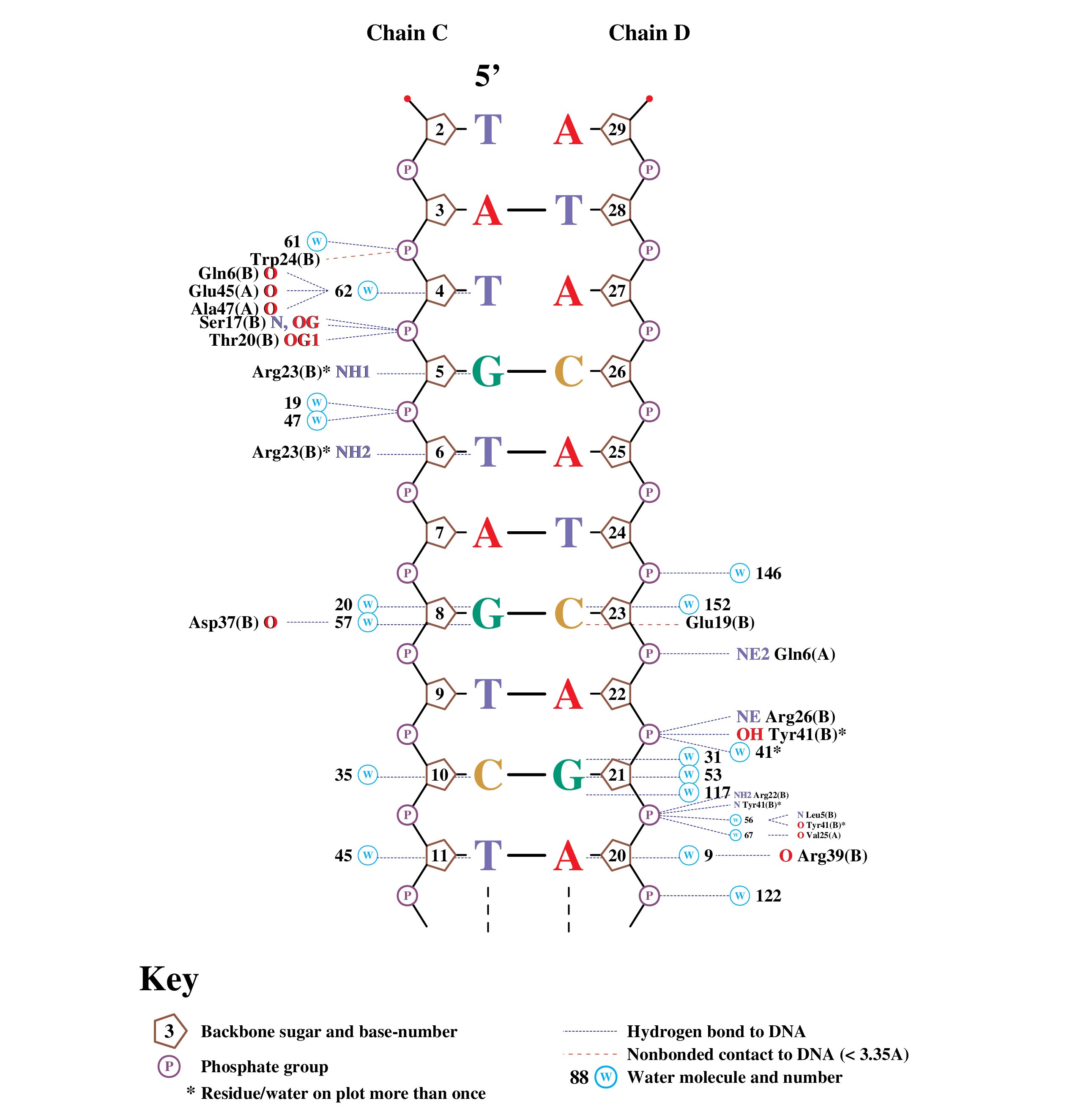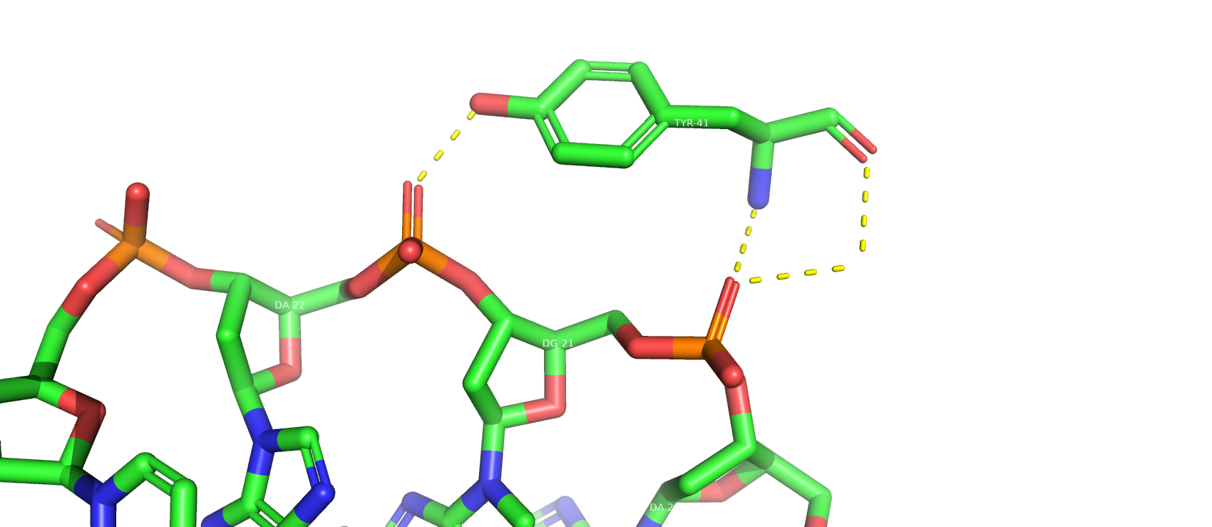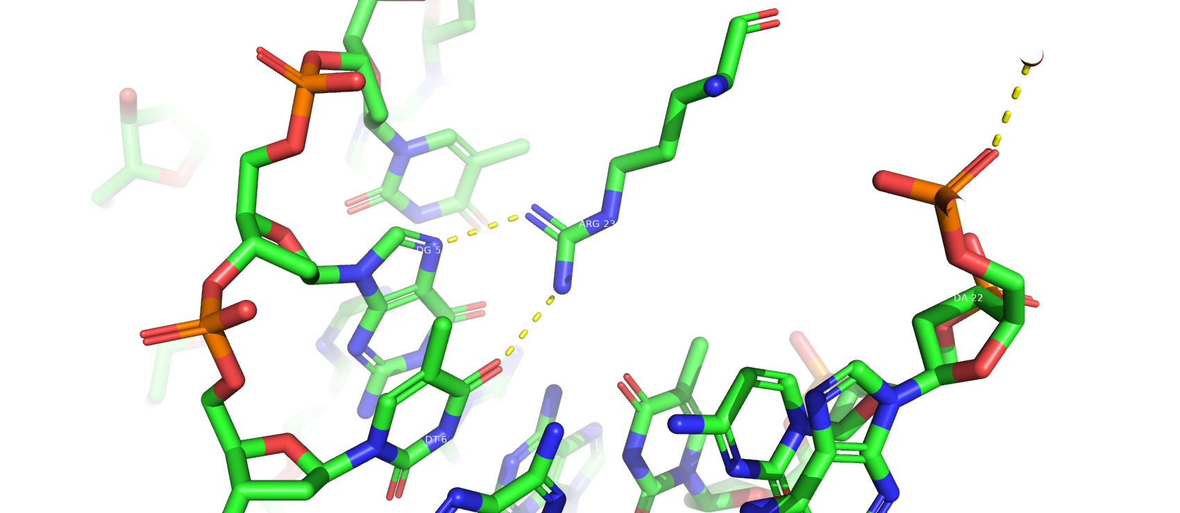 Судя по полученной схеме, наибольшее число контактов с ДНК реализует Tyr41 цепи B. Он образует две водородные связи с кислородами остатков фосфорной кислоты остова ДНК, а также образует водородную связь с молекулой воды, которая, в свою очередь, формирует водородную связь с одним из этих фосфатов (см. рис.2). В распозновании же последовательности ДНК, скорее всего, главную роль играет Arg23. Он формирует две водородные связи с азотистыми основаниями ДНК через большую бороздку: с 5-м гуанином и с 6-м тимином (см. рис. 3). Другие аминокислоты взаимодействуют с азотистыми основаниями ДНК только через молекулы воды и вносят меньший вклад в распознавание последовательности.