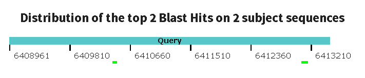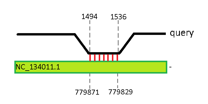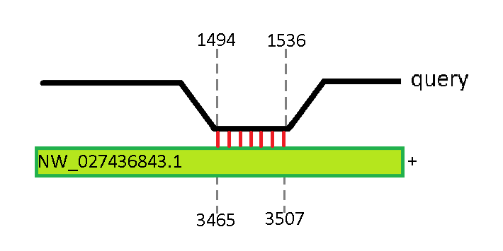 При выравнивании 23S рРНК E. coli было обнаружено 110 хитов, из которых E-value менее 10^-2 имело 100 находок. На скэффолде NW_027436843.1 расположен один гомолог, содержащий участки 198-290 (участок 1), 1898-1983 (2), 2233-2300 (3) и 2442-2613 (4). На скэффолде NW_027436843.1 было обнаружено 8 гомологов, содержащих те же 4 участка. На прямой цепи 40 хромосомы обнаружено 4 гомолога, содержащих 3 и 4 участки, и 5 гомологов, содержащих все 4 участка. На обратной цепи той же хромосомы - 9 гомологов, содержащих все 4 участка.