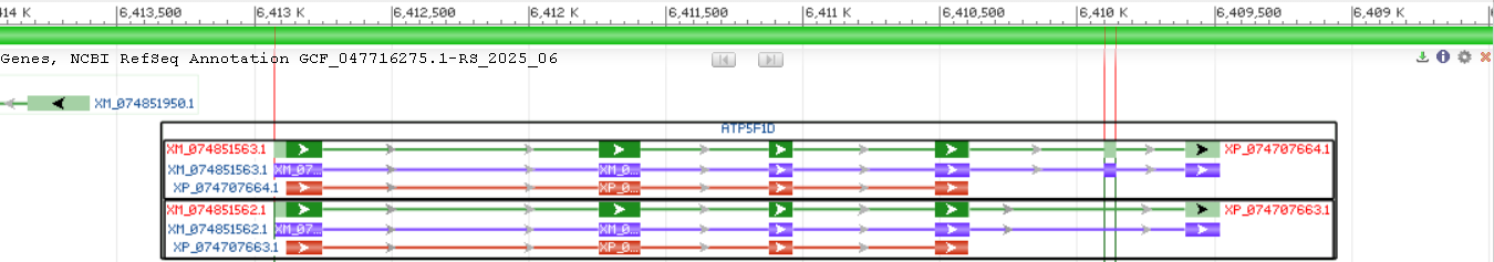 В таблице белковых последовательностей для сборки генома Длиннохвостой неясыти (лат. Strix uralensis) было найдено две записи, соответствующих дельта субъединице АТФ синтазы F (id: XP_074707663.1, с которым проводилась дальнейшая работа и id: XP_074707664.1). Соответствующие этим записям аминокислотные последовательности абсолютно идентичны (см. сопроводительные материалы 1), но получены с отличающихся вариантов транскрипта одного гена ATP5F1D (GeneID: 141935415, см. рис. 1, последовательность CDS и прилегающих к ней участков см. в сопроводительных материалах 2). Данный ген относится к нуклеотидной записи с идентификатором NC_133998.