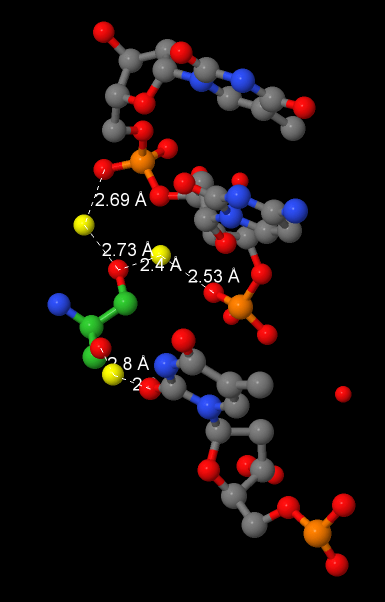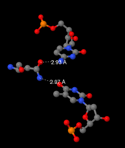 Белок в основном взаимодействует с сахаро-фосфатным остовом молекулы, также контактирует с азотистыми основаниями в обеих бороздках (особенно в большой бороздке).