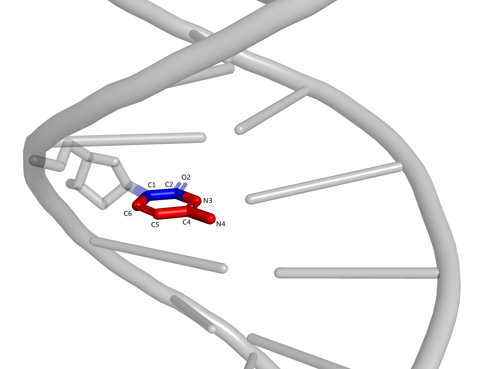 В сторону большой бороздки обращены атомы азотистого основания: N3, C4 (N4 тоже соотвественно), C5 и C6