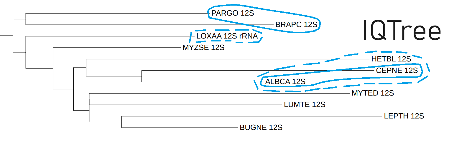 Дерево по нуклеотидной последовательности 12S рРНК, полученное при помощи IQtree получилось неплохим. И мне стало интересно, станет ли оно лучше, если добавить внешнюю группу (спойлер: нет):