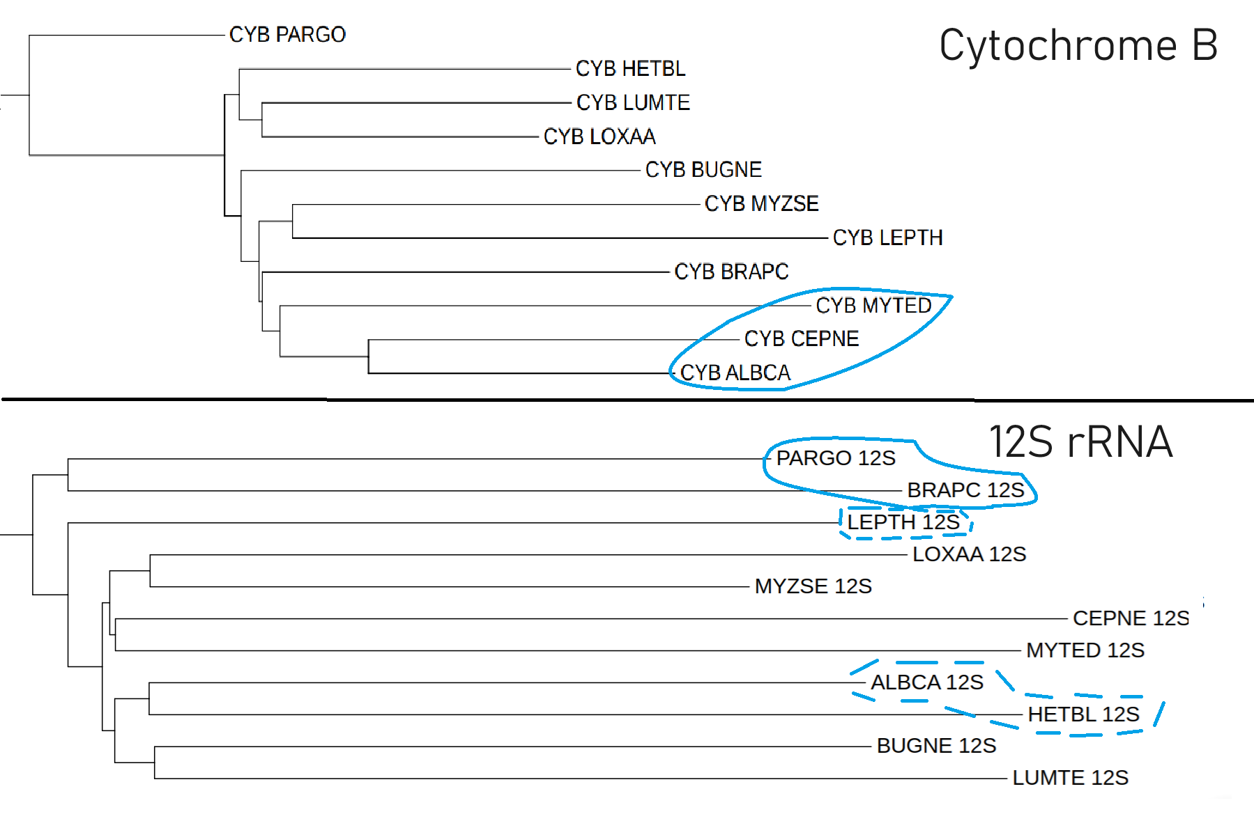 Однако оба дерева не смогли объединить MYZSE и LUMTE в группу Annelida, показать отдаленность от всех остальных видов LOXAA, LEPTH и BUGNE, а также полностью реконструировать группу Mollusca, состоящую из HETBL, MYTED и CEPNE с ALBCA.