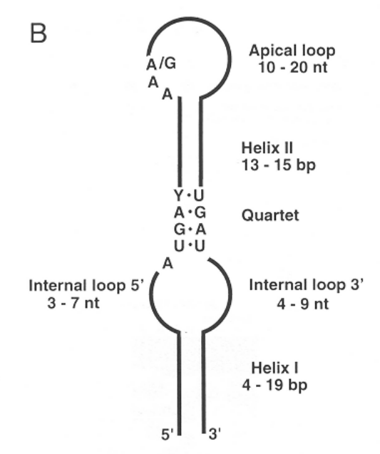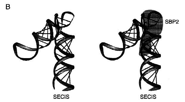 Система декодирования сигнала у эукариот включает как минимум два белка: фактор элонгации, специфичный для селеноцистеин-тРНК (eEFSec) и SECIS-связывающий белок 2 (SBP2), взаимодействующий с последовательностью SECIS в 3'-нетранслируемой области (3'-НТО) транскрипта мРНК селенопротеинов (рис. 3, 4) [2]. SECIS имеет минимальный функциональный размер 50–60 нуклеотидов, представляет собой структуру стебль-петля (шпильку) с тремя консервативными последовательностями: AUGА, (A)AA, GA (рис. 1, 2). Консервативные остатки (А)AA находятся на 5'-стороне апикальной петли, а основания AUGA и GA расположены близко друг к другу на противоположных сторонах спирального стебля [3]. Существует два типа эукариотических SECIS: тип I и тип II, которые отличаются наличием дополнительной спирали 3 в типе II. На рис. 2 приведены примеры сигнала SECIS эукариот, а именно консенсусные последовательности обоих типов [9].