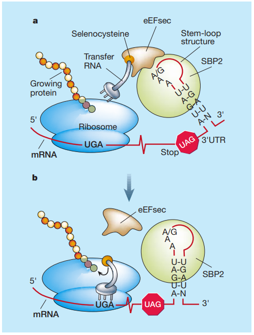 Все живые организмы обладают способностью преобразовывать кодоны UGA из сигнала о прекращении трансляции в кодон селеноцистеина (Sec). Белки, в которые успешно включается Sec, называются селенопротеинами и выполняют функции оксидоредуктаз [1].