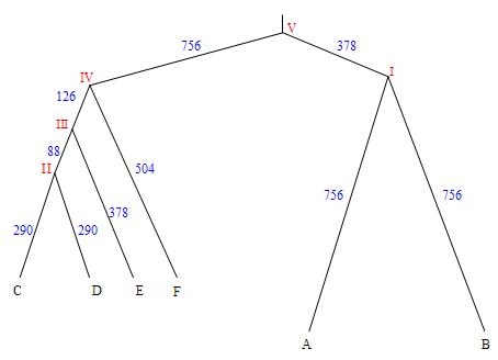 Оно является укоренённым, т.к. в корне (обозначено V) находится последовательность гена белка rho_ecoli, в которую были внесены мутации с учётом приведённых здесь эволюционных расстояний (они отмечены синим), рассчитанных на длину гена. В результате были получены последовательности, отвечающие листьям дерева, как то: А, B, C, D, E, F.