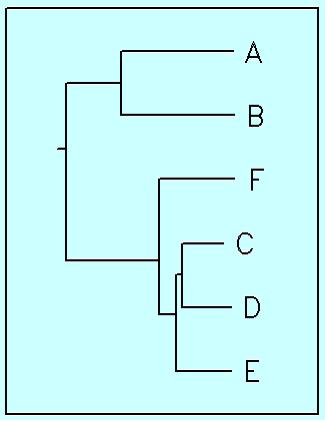 неукоренённое дерево Здесь есть точка, из которой, может показаться, выходит три ветви: это не так, просто ветвь, соединяющая кластер (C;D) с E очень короткая, в скобочной формуле её длина всего 2 сотых, а программа, как видно, соблюдает масштаб. Но в принципе, это болееменее отвечает нашей эволюционной модели.