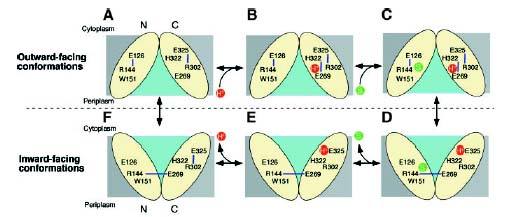 Возможный механизм лактозы-протон симпорта ( N- и C-концевые домены показаны желтыми овалами,обозначены ключевые аминокислотные остатки, водородные связи показаны голубыми линиями.Протон и субстрат показаны красными и зелеными кругами соответственно.Гидрофильная впадина показана, как светло-голубая область):