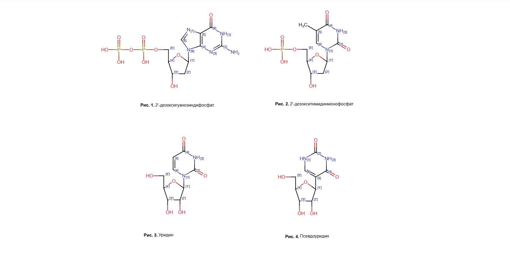 В данном упражнении необходимо было нарисовать и пронумеровать структуры следующих четырёх соединений: 2'-дезоксигуанозиндифосфат, 2'-дезокситимидинмонофосфат, уридин, псевдоуридин.