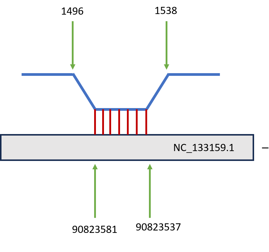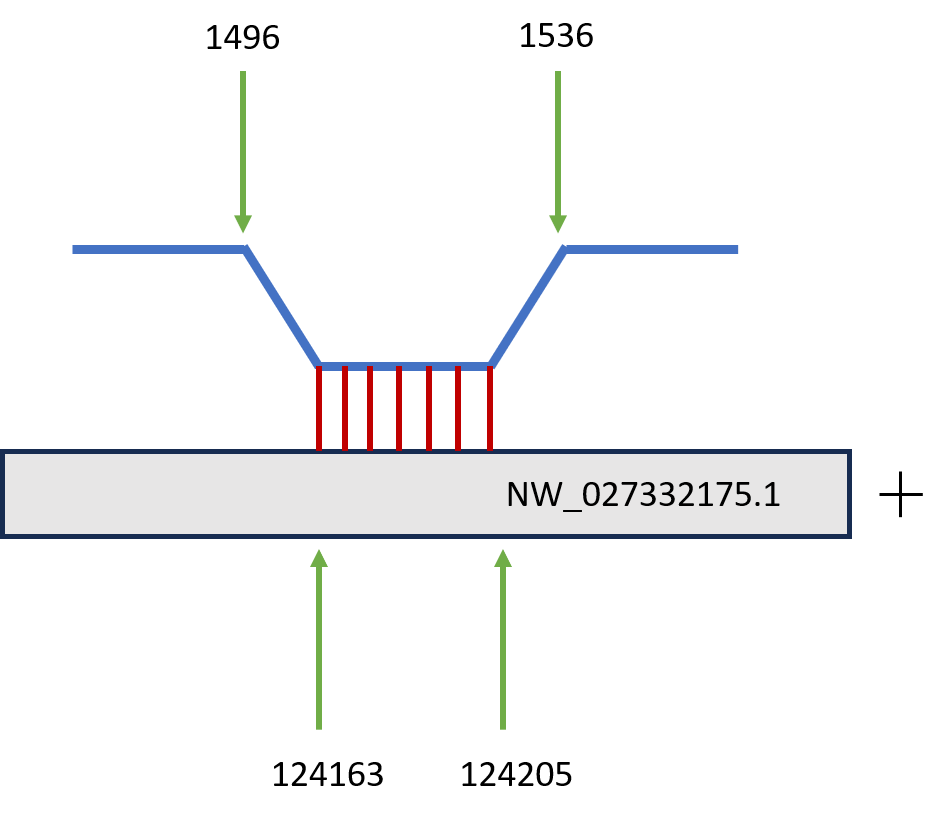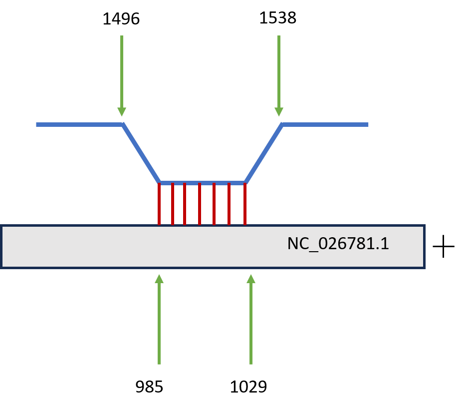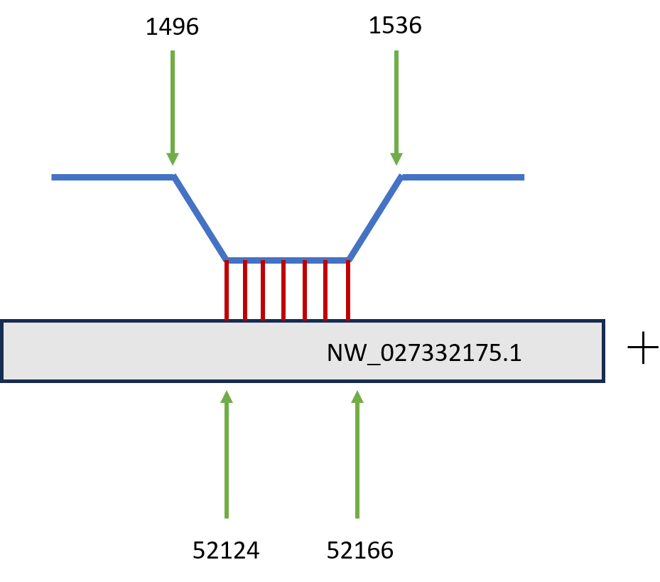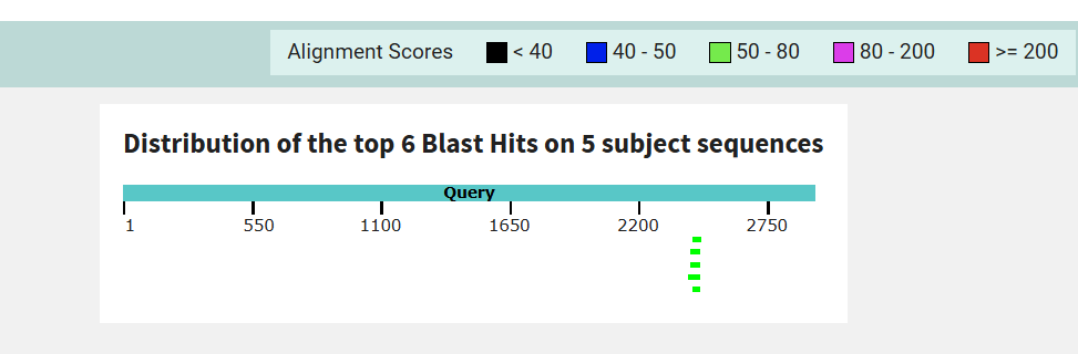 В результате локального поиска BLAST с помощью алгоритма blastn для 16S рРНК было найдено 22 хита, из которых только 6 имели значение E-value меньше 0.05; из них было выделено 6 гомологов, соответствующих участку 1496-1536, исходя из координат выровненных участков: на скэффолде NW_027332175.1 было найдено 4 гомолога, на скэффолдах NC_026781.1 и NC_133159.1 было обнаружено по одному гомологу. Для 23S рРНК было найдено 47 хитов, из которых лишь 28 содержает значение E-value меньше 0.05. Из них можно выделить 12 гомологов (на скэффолде NW_027332175.1 4 гомолога, на скэффолдах NC_133166.1, NC_133164.1, NC_133161.1, NC_026781.1, NC_133174.1, NC_133160.1, NC_133159.1, NC_133157.1 по одному гомологу). Ниже приведены схематичные результаты выравнивания для всех шести гомологов, найденных на 16S рРНК.