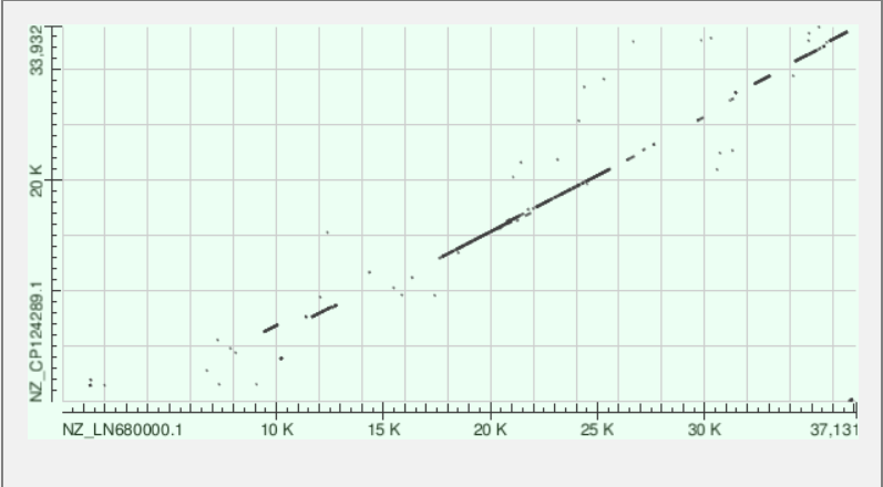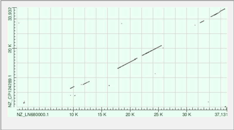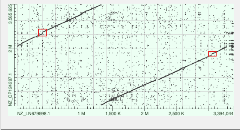 Для построения карты локального сходства были подобраны две геномные последовательности, для которых дотплоты, построенные с помощью алгоритмов megablast, blastn и tblastx заметно различаются в связи с разными принципами работы этих алгоритмов. Были выбраны хромосомы двух штаммов бактерии Paraclostridium sordellii: ATCC 9714 (AC — NZ_LN679998.1) и C125 (AC — NZ_CP124287.1). Данные последовательности были найдены при помощи поиска в NCBI Genome. Организмы подбирались таким образом, чтобы оба имели хромосомный и выше уровень сборки генома, имели различные элементы генома (хромосомы и плазмиды), а также являлись бы представителями разных штаммов одного и того же вида бактерий, для более достоверной интерпретации результатов. Ниже приведены карты для хромосомы двух разных штаммов бактерии Paraclostridium sordellii (см. Рис. 10, 11.), построенные с помощью megablast и blastn, так как алгоритм tblastx не укладывается во временные рамки вычислений из-за размера участка поиска (размер хромосомы — 3.4 Mb), а также отдельно карты, построенные для плазмид тех же штаммов с помощью всех трёх алгоритмов (см. Рис. 12, 13, 14).