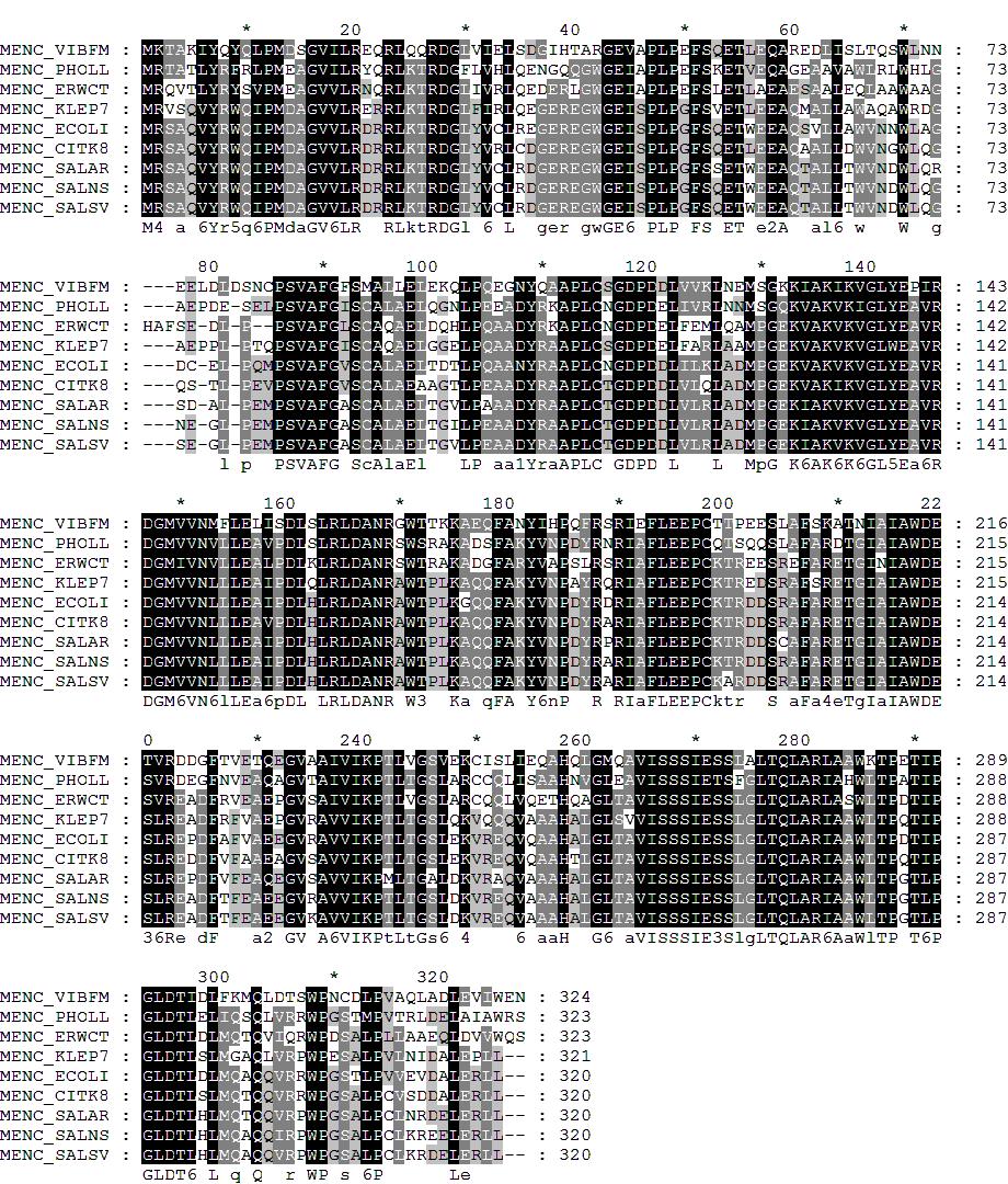 sw:menc_vibfm 262-270 262-268 sw:menc_pholl 261-269 261-267 sw:menc_erwct 261-269 261-267 sw:menc_klep7 261-269 261-267 sw:menc_ecoli 260-268 260-266 sw:menc_citk8 260-268 260-266 sw:menc_salar 260-268 260-266 sw:menc_salns 260-268 260-266 sw:menc_salsv 260-268 260-266