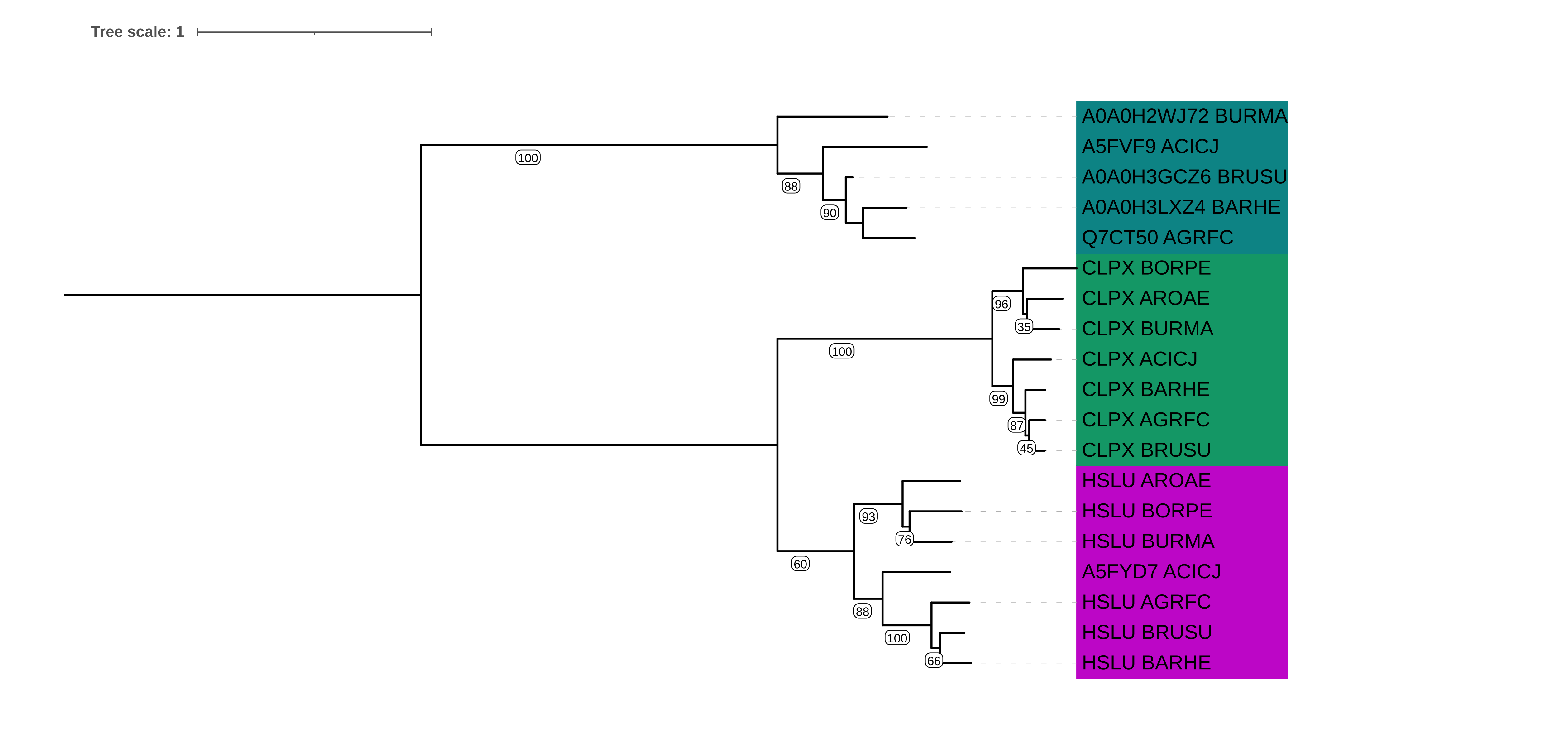 Рис. 1. Дерево построенное по аминокислотной последовательности гомлогов белка CLPX_ECOL, с помощью программы fastme, использующей метод ME, оценивающее эволюционное расстояние с помощью модели LG, укорененное в среднюю ветвь и с бутстрепом 100, разными цветами выделены белки ортологи