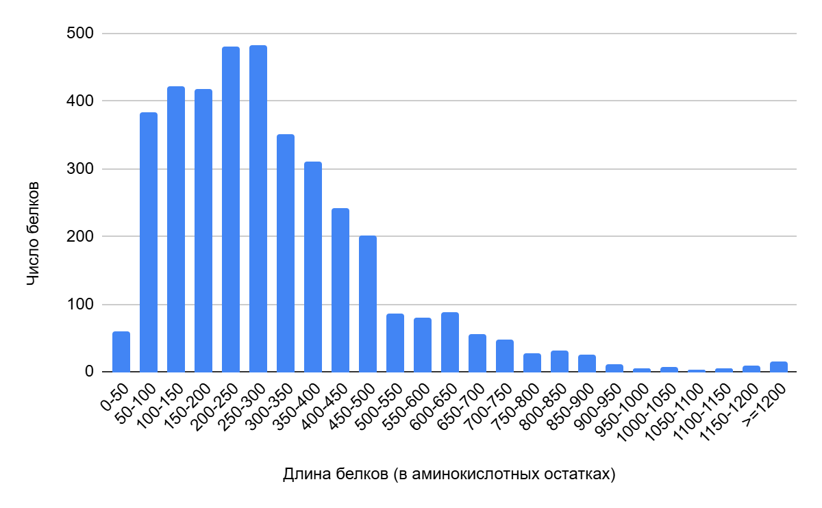 Как видно из Рисунка 1, наиболее распространённая длина белка находится в диапазоне от 150 до 350 аминокислотных остатков (а.о.), с выраженным пиком в районе 200–300 а.о.